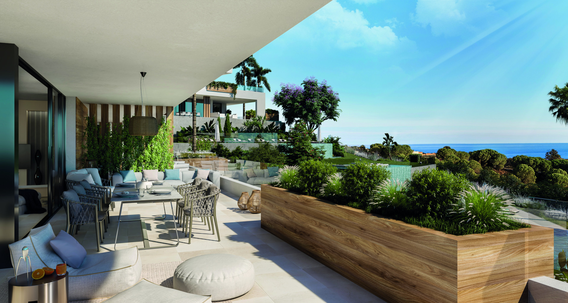 Квартира состоит из просторной гостиной совмещенной со столовой с выходом на большую частично крытую террасу с обеденной зоной, зоной для отдыха и шезлонгами; отдельную полностью меблированную и оборудованную кухню с прачечной; 3 спальни, одна из них с ванной комнатой, а остальные разделяют ванную комнату; гостевой туалет. Кроме того, у собственности есть просторный солнечный сад. 1 парковочное место и кладовая, расположенные в подземном общем гараже. На территории жилого комплекса есть полностью оборудованный спортивный зал и бассейн.